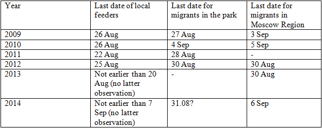 Since 2009, he regularly observes evening feeding of Swifts over the Izmaylovski Park from a window of his apartment at the Entuziastov Str. in Moscow. In 2014, the first wave of departure appeared as usual in late July. Then however the Swifts delayed more than usually (see the table). Flocks from 2-3 to 10-15 individuals were seen even after 30 Aug. This behaviour may be affected by the weather, which stayed warm from the 2nd half of August to the 1st week of September.